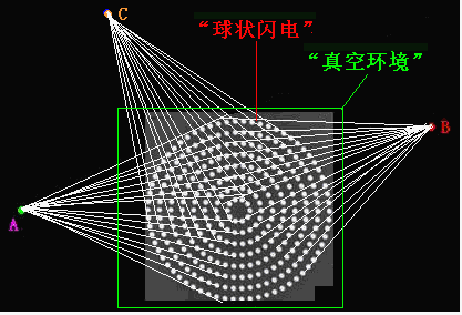 如圖12,A、B、C等處的光源發(fā)出的光線,在通過(guò)“球狀閃電”時(shí),都在“球狀閃電”中的“光子流體能量負(fù)壓”的作用下,被“吸入”“留住”作“圓周運(yùn)動(dòng)”,而不能穿過(guò)“球狀閃電”,光源對(duì)面的觀察者將不能看到這個(gè)光源發(fā)出的光線——呈現(xiàn)“黑洞效應(yīng)”。